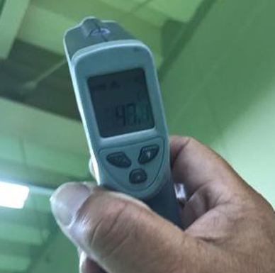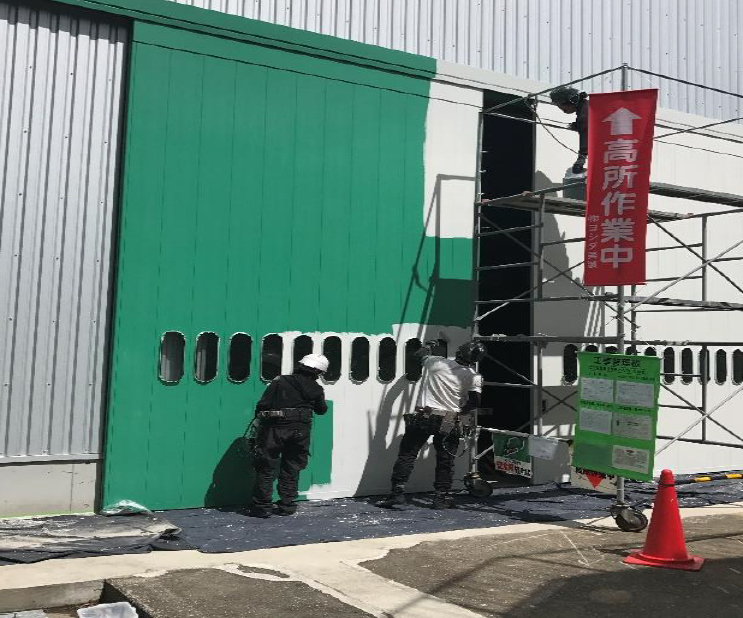 この工場では元々エアコン設備がなく、5馬力の業務用エアコンを13台導入する予定だった。その後自社の遮熱塗料を塗り、エアコンを9台に減らす計画になり塗装工事を行った。